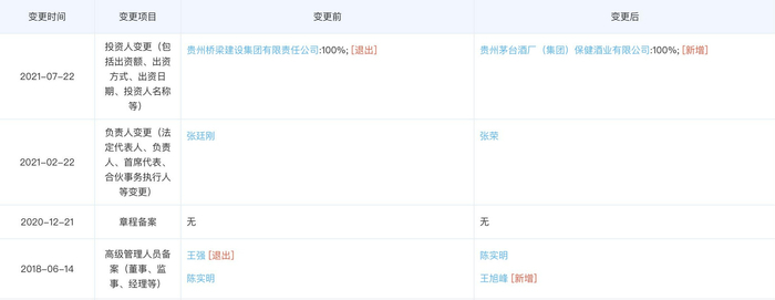 回溯至2021年3月初,便有传言称,贵州仁帅酒业的生产线要交给茅台集团。新京报记者通过天眼查查询发现,仁帅酒业的投资人已于7月22日发生了变更,由变更前的贵州桥梁建设集团有限责任公司100%持有,转变为茅台集团保健酒公司100%持有。