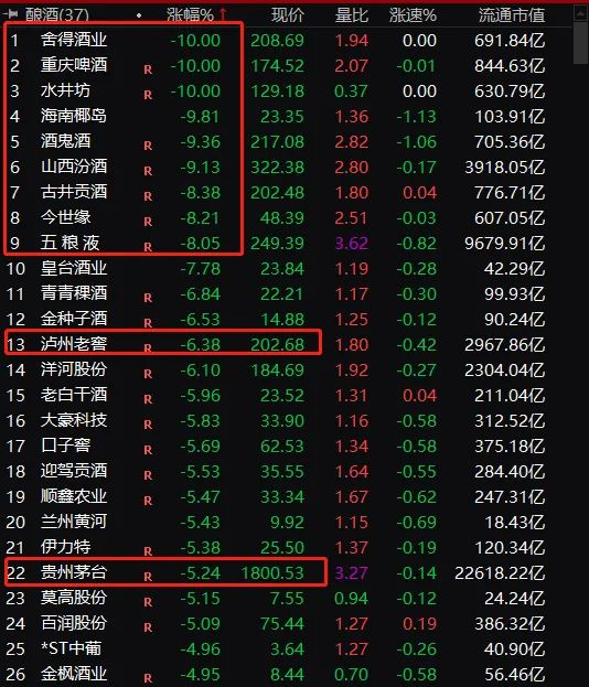 白酒概念板块午后持续下挫,贵州茅台股价跌逾5%,失守1800元关口,成交额超111亿元,总市值跌至22586亿元。