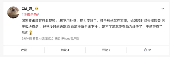 7月26日,上午收盘,白酒、教育、医疗全线大跌。#股市走势#冲上热搜,引起网友讨论。