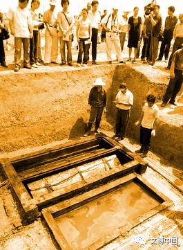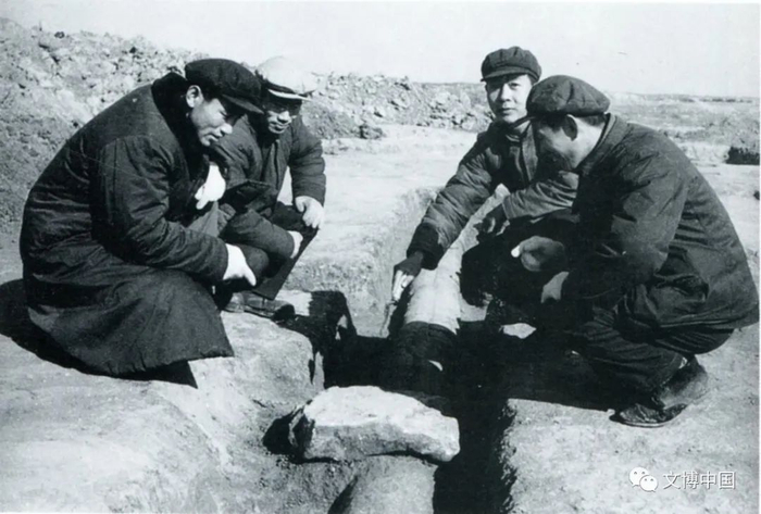 1976年李伯谦(右、北)、高崇文(左、南)、陈贤一(右、南)、刘金山(左、北)诸位先生讨论盘龙城宫殿排水管道