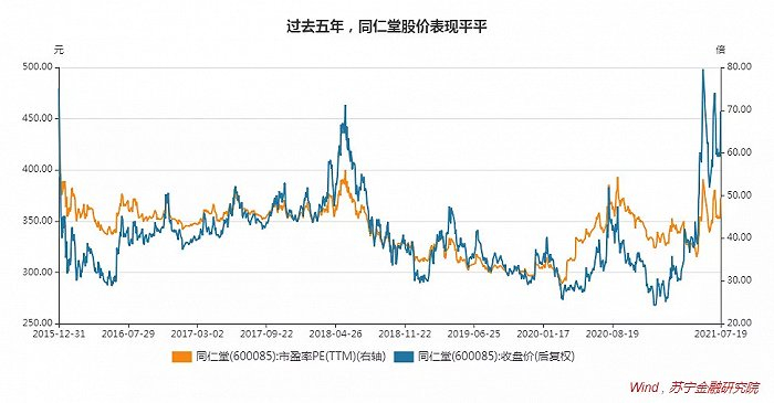 同仁堂处于核心赛道,品牌价值独一无二,但过去五年的经营业绩却略显普通,过去5年(2015年-2020年)营收复合增速仅为3.48%,5年净利润复合增速仅为3.34%,受此拖累,同仁堂的总市值过去五年内一直在区间震荡,没有大行情。