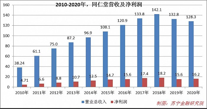 从过去十年的发展历程看,2010-2018年,同仁堂一直保持着稳定增长,营收复合增长17.8%,净利润复合增长16.1%。但自2019年以来,营收连续两年下滑,开始增长乏力。
