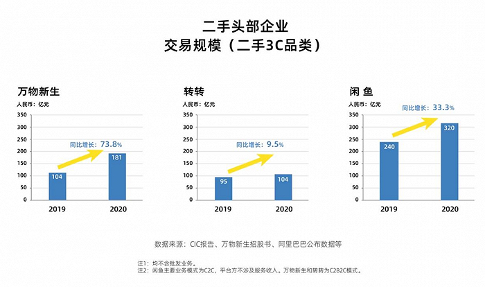CIC数据显示,闲鱼、万物新生、转转在2020年二手3C产品GMV分别为320亿元、181亿元、104亿元,分别较去年同期增长33.3%、73.8%和9.5%。