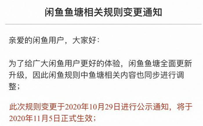 2020年10月底,闲鱼正式发布公告,直播业务、鱼塘业务等过去的重要入口相继被取消。截至2020年8月,闲鱼已有各类鱼塘超40万个。