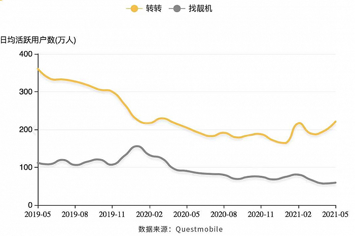 2019年,转转开启第三次转型之路,将发展方向聚焦于二手3C市场,并在2020年5月收购二手手机B2C平台“找靓机”,转型成为二手3C垂类电商。但收购之后转转的月活用户却在持续下降,最近两年的降幅更是达到40%。