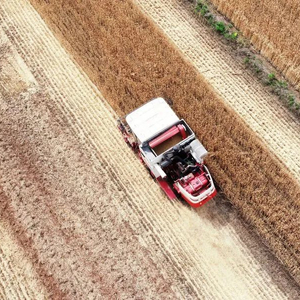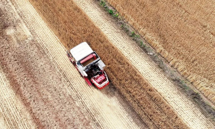 6月1日在山东省临沂市郯城县郯城街道三井村田间拍摄的收割现场(无人机照片)。新华社发(张春雷摄)
