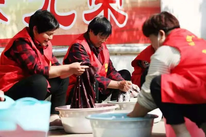 5月21日,山东省临沂市郯城县港上镇珩头西村洗衣志愿者在清洗收集的衣服。山东省临沂市郯城县港上镇为全镇23个村配备全自动洗衣机,并选拔志愿者257名,开展“孝老洗衣坊”志愿服务活动。洗衣志愿者定期收集村内独居和孤寡老人的衣物集中送至村内洗衣点,人工或者用洗衣机进行分类清洗,晾晒完毕后,再分叠整齐送回老人家中。新华社发(张春雷 摄)