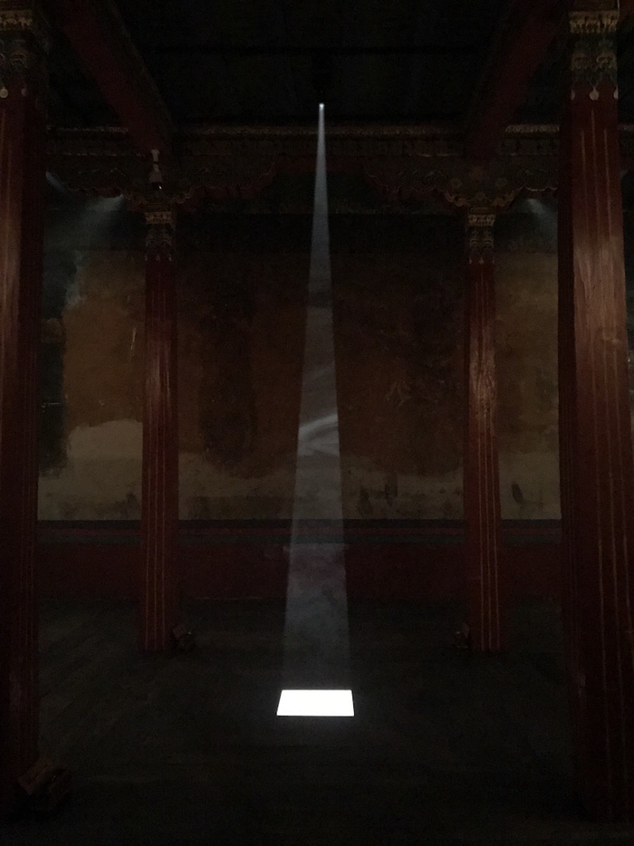 对于建筑改造的考量,水雁飞认为,这座建筑是一个圣坛——曼陀罗,其平面是一个超级秩序的反映,“所以把其最古老的那些东西聚焦呈现是第一个想要做的事情;第二,这座建筑每边有四扇窗户,但内部很暗。日本有一位作家写过一本书,讲的是黑暗中的层次。所以,我们也试图维系它那个比较暗的氛围,呈现暗的多个维度。然后,我们通过灯光,以及铺设了老榆木地板,来反映一些温暖的状态。”参与灯光设计的王贤则表示,“希望以光作为一种节奏,带动空间的流动,将展厅内的氛围流转起来。”