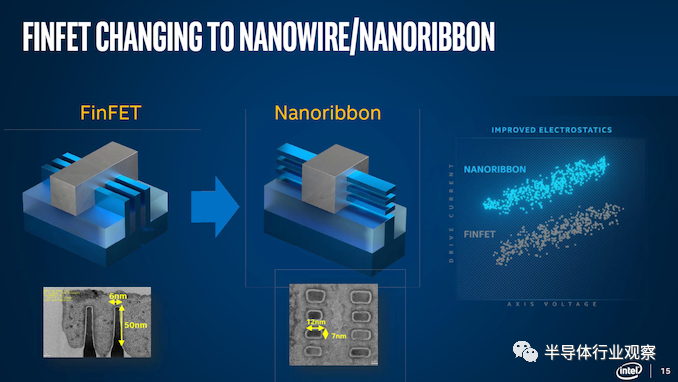 如上文所说,转向 20A 时,英特尔的工艺名称指的是埃而不是纳米。也就是在这个时刻,英特尔将从其 FinFET 设计过渡到一种新型晶体管,称为 Gate-All-Around 晶体管或 GAAFET。在英特尔的案例中,他们为其版本提供的营销名称是 RibbonFET。