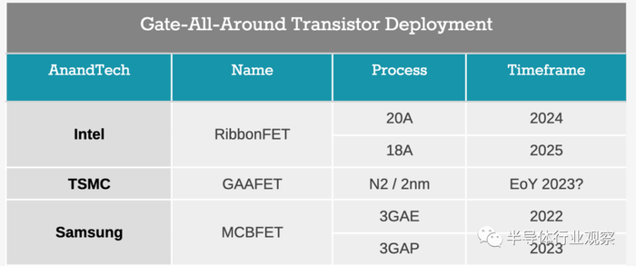 多年来,英特尔一直在半导体技术会议上讨论 GAAFET,在 2020 年 6 月的国际 VLSI 会议上,时任Intel CTO的 Mike Mayberry 博士展示了一张图表,其中包含转向 GAA 设计的增强静电。当时我们询问了英特尔批量实施 GAA 的时间表,并被告知预计“在 5 年内”。目前,英特尔的 RibbonFET 将采用 20A 工艺,根据上述路线图,很可能在 2024 年底实现产品化。