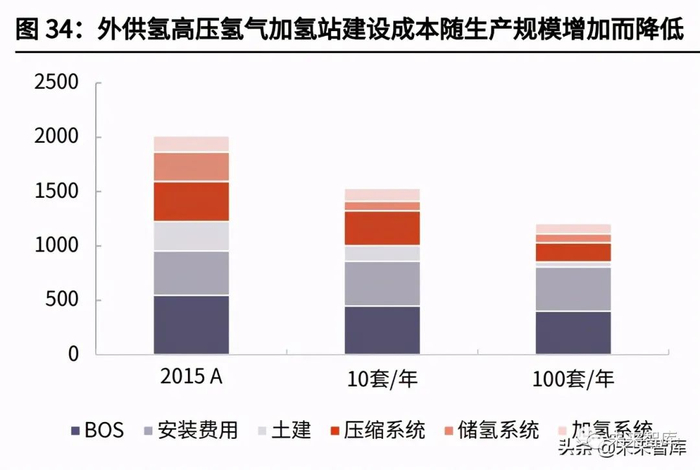 目前我国建设一个日均加氢量 500kg 的 35MPa 固定式加氢站的建设成本约 1200 万元(对应单位投资 2.4 万元/kg·d);而根据 Ahmad Mayyas 等人的研 究结果,如果生产规模增加到 100 套/年,加氢站建设成本较 2015 年可降低 40% 左右。未来,随着设备生产规模的扩大,规模经济影响显著,压缩系统、储氢系 统以及加氢系统的成本将明显下降,外供氢高压氢气加氢站的总成本将有很大的 下降空间。