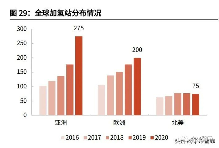 在全球氢能行业快速发展的背景下,作为产业上游制、储环节与下游应用市场的 枢纽,加氢站的建设受到了各个国家和地区的高度重视。燃料电池车是氢能应用 的重要一环,其与氢能基础设施建设的发展密切相关;全球加氢站建设从 2016 年起逐步提速,根据 H2Stations 的统计数据,2020 年全球加氢站数量新增 119 座至 553 座,其中亚洲 275 座(主要集中在中国、日本、韩国)、欧洲 200 座 (主要集中在德国、法国)、北美 75 座(主要集中在美国)。