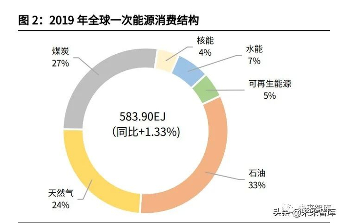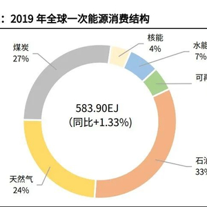 在全球的能源系统中,煤炭、石油、天然气等化石能源仍是能源消费的中坚力量。 根据《BP 世界能源统计年鉴》的相关数据,2019 年全球一次能源消费总量为 583.90EJ(艾焦耳,即 10 18 焦耳),同比增长 1.33%;其中煤炭/石油/天然气 占比分别为 27%/33%/24%(总占比 84%);2019 年中国一次能源消费总量达 141.70EJ,其中煤炭/石油/天然气占比分别为 57%/20%/8%(总占比 85%)。无论是全球的能源系统还是中国的能源系统,化石能源在能源消费结构中占比仍 超过 80%,其也是大多数温室气体排放的根源。