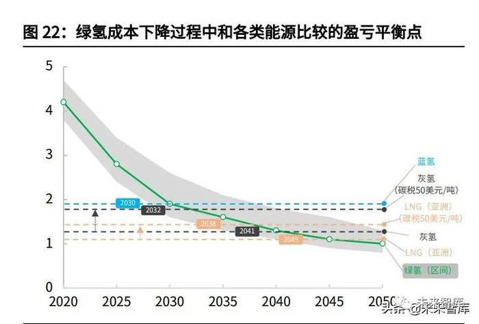 绿氢生产成本仍相对较高,未来降本空间潜力较大,且碳税的增加有望加快绿氢 对其他能源类型的替代。在现有技术和规模的情况下,绿氢的生产成本仍相对较 高(约 4 美元/kg H2,灰氢和蓝氢的生产成本在 1.5~2 美元/kg H2左右);但是 随着可再生能源电价的持续降低和电解槽技术的提升,绿氢生产成本仍将持续下降;如果考虑到碳税在未来的引入(假设 50 美元/吨),则绿氢的生产成本分别 有望在 2030/2032/2038 年超过蓝氢/灰氢/LNG(亚洲)。
