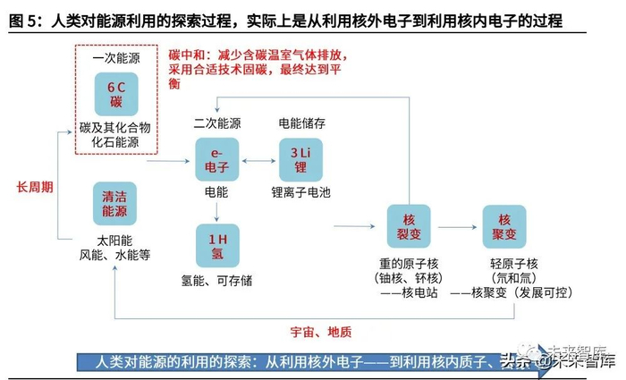 回顾人类对能源利用的探索历程,实际上是从利用核外电子到利用核内电子的过 程,但这恰是宇宙、物质、能源发展的逆过程。二次能源中,对电能的利用是一项伟大的革命,现已成为能源利用的枢纽,从历 史上看,“电”也引发了多次生产技术革命。而氢能同作为二次能源,具有可存储的优势,但也因制备和使用效率稍逊而经济性较差,但从能量循环的角度看, 可以有助于碳的减排。