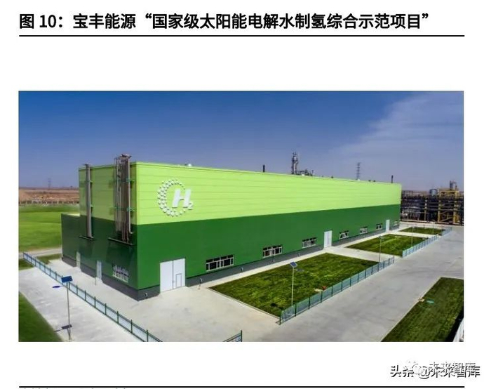 (3)2021 年 4 月 20 日,由宝丰能源组织实施的“国家级太阳能电解水制氢综 合示范项目”在宁夏正式投产,包括 20 万千瓦光伏发电装置和产能为 2 万标方 /小时的电解水制氢装置,是目前全球单场规模最大、单台产能最大的电解水制 氢项目。公司计划用 20 年时间,实现以新能源制取的绿氢替代燃料煤制氢,使 公司摆脱煤炭资源制约,实现二氧化碳的近零排放。