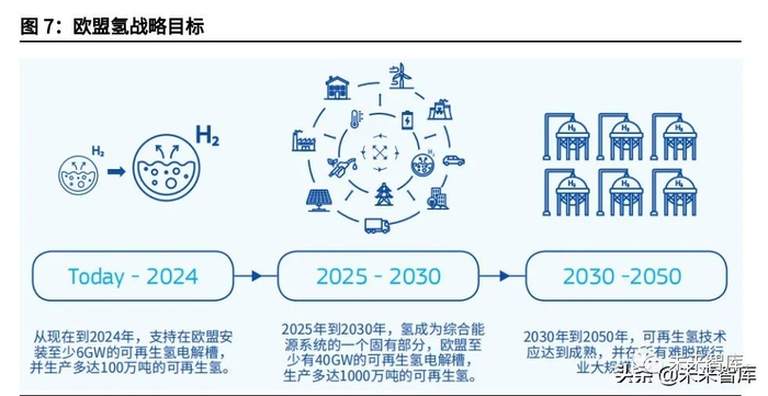 (2)欧盟:能源系统与清洁氢的有机结合是重要发展方向。欧盟整体已于 1990 年实现碳达峰,并于 2018 年 11 月提出“碳中和”愿景,后于 2019 年 12 月发 布《欧洲绿色协议》和配套的《气候中立欧洲的氢战略》(以下简称《氢战略》)。《氢战略》提出:从 2020 年到 2030 年,电解槽的投资可能在 240 亿到 420 亿 欧元之间。此外,在同一时期,将需要 2200-3400 亿欧元来扩大和直接连接 80-120 千兆瓦的太阳能和风能生产能力到电解槽,以提供必要的电力;对现有 一半工厂进行碳捕获和储存改造的投资估计在 110 亿欧元左右;此外,投资 650 亿欧元用于氢运输、分配和储存,以及氢加油站。从现在到 2050 年,欧盟对氢 产能的投资将达到 1800-4700 亿欧元。