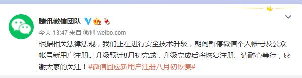 7月27日,腾讯微信团队通过微博发布消息称,根据相关法律法规,我们正在进行安全技术升级,期间暂停微信个人账号及公众账号新用户注册。升级预计8月初完成,升级完成后将恢复注册。