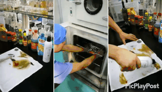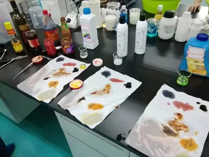 在一块白布上涂满了酱油、辣椒油、红酒、番茄酱、辣椒酱,然后在烘干机中烤干;这种「混合顽固污渍」,市场上常见洗衣液是基本搞不定的。