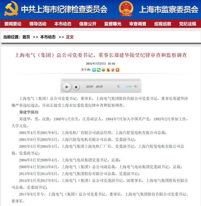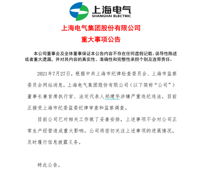 7月27日,根据中共上海市纪律检查委员会、上海市监察委员会网站消息,上海电气(集团)总公司党委书记、董事长,上海电气集团股份有限公司党委书记、董事长郑建华涉嫌严重违纪违法,目前正接受上海市纪委监委纪律审查和监察调查。