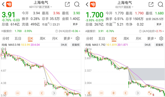 截至7月27日收盘,上海电气A股股价报3.91元/股,H股股价报1.7港元/股。自子公司业绩爆雷以来,其A股股价累计下跌23.03%,港股累计下跌30.02%,A、H股市值合计已蒸发近300亿人民币。