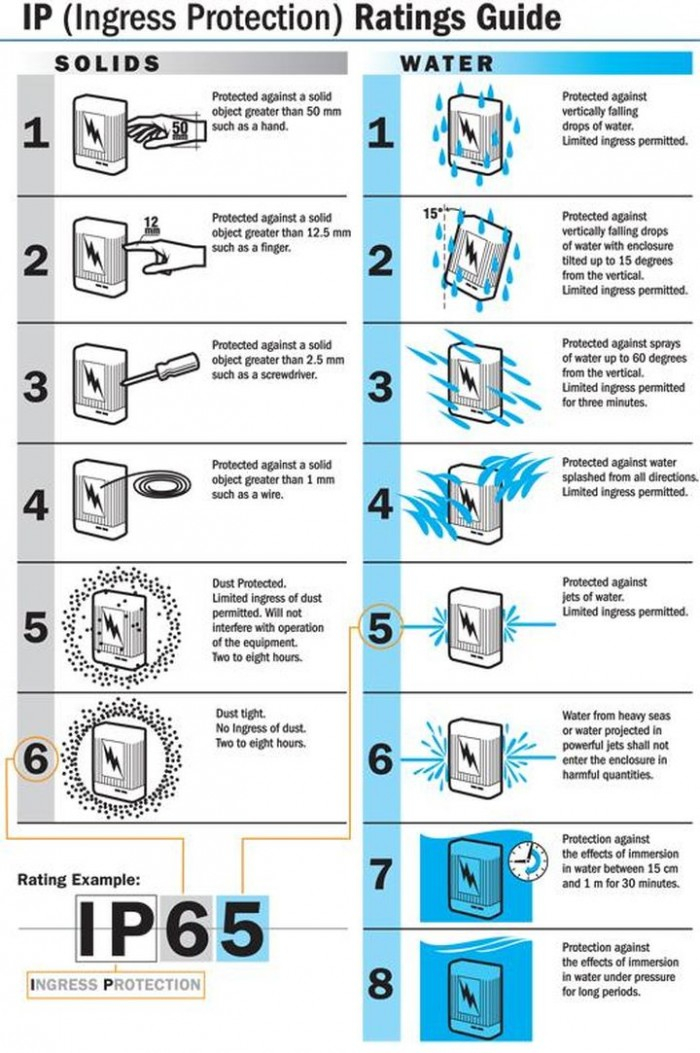 这里的 IP 的全称是“Ingress Protection”(侵入保护)。IP 防护等级是由两个数字所组成,第 1 个数字表示电器防尘、防止外物侵入的等级(这里所指的外物含工具,人的手指等均不可接触到电器之内带电部分,以免触电),第 2 个数字表示电器防湿气、防水浸入的密闭程度,数字越大表示其防护等级越高。