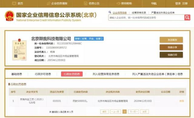 事实上,酷我音乐因侵犯用户权益,曾多次被相关部门点名。记者查询发现,去年底,北京市海淀区市场监管局向北京酷我科技有限公司下达了一则行政处罚决定书。