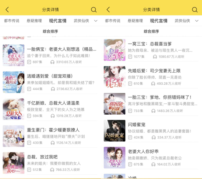 此外,酷我音乐在界面上保留了多类不宜未成年人观看、收听的内容,栏目分区包含主播电台、视频等。在上述分区下,用户时常可以刷出“大叔跟你谈情说爱”,“甜宠贴身辣妻”等类似标题,点击即可收听观看。
