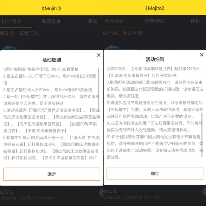 与此同时,酷我音乐在青少年模式下,仍允许未成年用户使用消费功能购买付费单曲、专辑等。平台通过“打擂”活动诱导鼓励用户多次、大额购买数字专辑。以周杰伦《Mojito》为例,达到一定数量后,即可获赠周杰伦签名专辑、限量周边产品等。