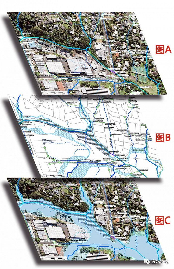 •超标系统(图C)-(如大于50年一遇)的降雨事件,主要设施包括:调蓄设施、城市河湖、超标泄流通道、地表淹没区域,预案以及应急响应非工程减灾手段。