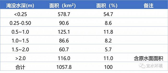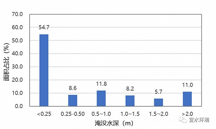 进一步统计淹没水深面积占比,最大积水深度超过 0.25m的面积为 479.1 km2,占总面积的 45.3%,其中,0.5~2m的面积为272.4 km2,占比25.8%;2m以上的面积达到116.0 km2。