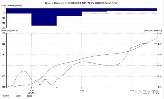 通过模拟2021年7月20日15时~7月20日21时间郑州站实际降雨,结果显示阜外医院周边区域水位6小时水位上升可达到2.25m左右。