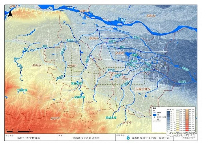 根据由此次专门收集的地形资料绘制而成的郑州市区域地形和水系图(图1),郑州中心城区在西南、西部低山丘陵和黄河之间呈西高东低,西南部整体地势由西南向东北倾斜,逐渐向东北过渡为黄土倾斜平原和黄淮冲击平原。