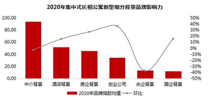从背景分布来看,2020年集中式长租公寓MBI品牌指数TOP100品牌中,41%的品牌为创业系背景,28%的品牌为房企系背景,国企系背景占比9%。相比2019年,房企系占比提升最为明显,提升了5%;而创业系占比下降了5%。