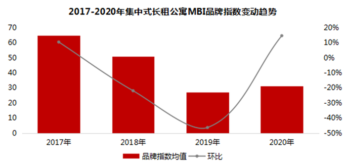 2020年品牌指数均值为31.14,环比2019年上升14.61%。2017-2019年,由于房企系和创业系对长租公寓领域布局频繁,新生集中式长租公寓品牌不断诞生,且多集中于MBI品牌指数尾部,导致集中式长租公寓MBI品牌指数出现下滑;2020年,房企系和创业系品牌运营能力普遍提升,品牌知名度和成熟度上升,带动品牌影响力随之升高,加之尾部品牌陆续出局,整体品牌指数止跌反弹。