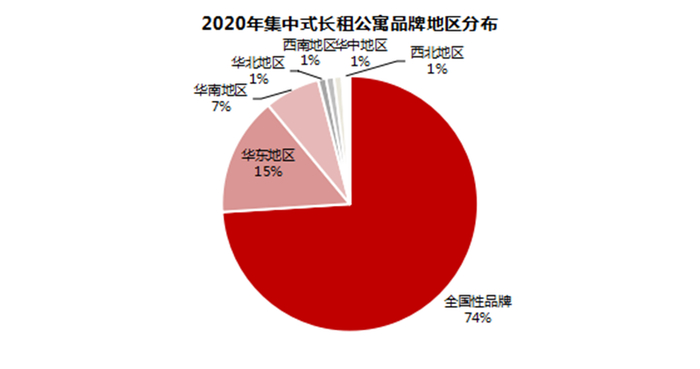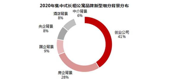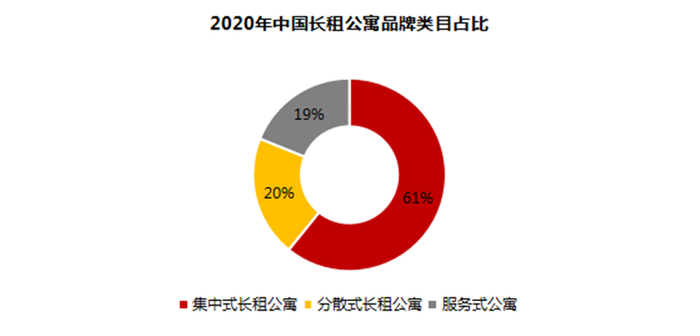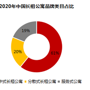 据迈点研究院监测到的中国长租公寓近2000家品牌不完全数据统计,截至2020年12月,国内长租公寓品牌中的分散式长租公寓和服务式公寓品牌分别占比两成左右,而集中式长租公寓占比六成。