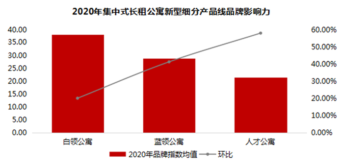 从细分产品线的品牌影响力来看,白领公寓品牌影响力最高。2020年,白领公寓品牌指数为38.15,在细分产品线的品牌指数中位于第一位。这主要因为白领公寓直接面对普通白领,客群覆盖面较大,门槛较低,发展速度最快,因此白领公寓是集中式长租公寓品牌布局最多的产品类型之一,品牌影响力也最高。