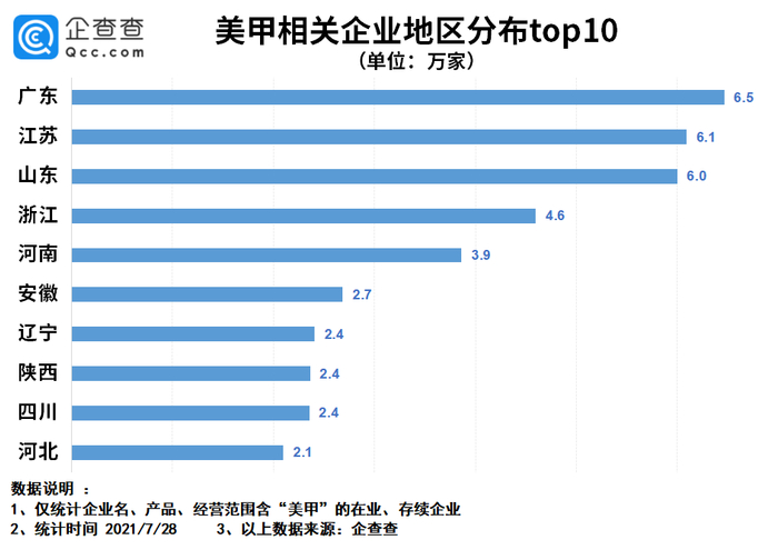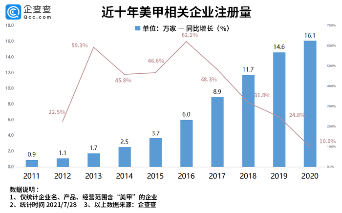 目前我国现存“美甲”相关企业共64.0万家。2020年是企业注册量的高峰期,全年共注册16.1万家,同比增长10.0%;今年上半年共注册11.5万家,同比增长109.1%。