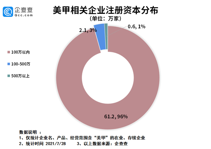 从注册资本来看,美甲相关企业注册资本在100万元以内的企业数量占96%,注册资本在100-500万元和500万元以上的分别占3%和1%。