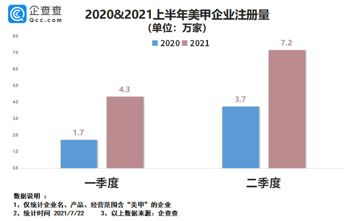从今年的注册量来看,2021年上半年,我国美甲企业注册量为11.5万家,同比增长了109.1%。从各季度注册量来看,今年一季度和二季度的注册量均呈同比增长趋势,分别注册了4.3万家、7.2万家相关企业。
