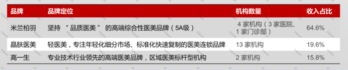 朗姿于2016年开始布局医美行业,通过外延并购及内生增长两种模式,截至2020年末已拥有19家医美机构,参股并受托管理机构1家,其中医院4家、门诊及诊所16家。朗姿拥有米兰柏羽、晶肤医美、高一生等三大品牌专注于不同的医美领域。