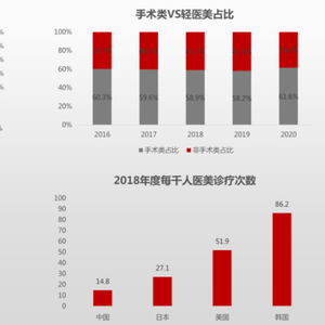 医美就是通过医疗的手段来达到美容的目的。医美项目分为手术类项目和非手术类项目(轻医美),手术类医美项目包括隆鼻术、面部抽脂等,非手术类项目包括注射类(注射类玻尿酸、肉毒毒素、微针)和声光电项目(热玛吉、热拉提、光子嫩肤、皮秒)等。轻医美因创伤小、风险低、恢复快而广受消费者推崇。