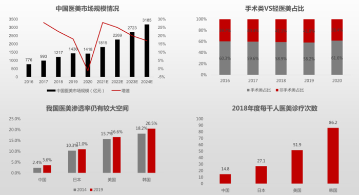 中国医美市场广阔。2016年中国医美市场规模776亿元,到了2020年市场规模达1418亿元,维持在17%的增速,增速高于医疗赛道里的其他行业,2024年市场规模有望达到3185亿元。