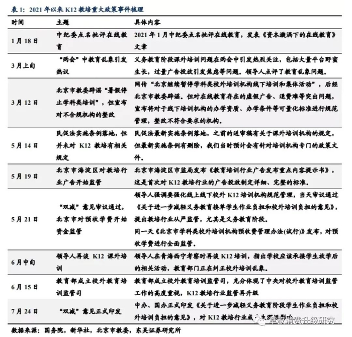据东吴证券研究所梳理,2021年1月,中纪委点名批评在线教育:3月上旬“两会”期间,义务教育课外培训机构同样引起了广泛关注,大量在线培训平台“野蛮生长”,针对内卷焦虑的社会现象,建议加强审查课外培训机构的广告投放,避免引发家长焦虑。领导人还指出教育不能唯分数论,点评了教育乱象问题;5月21日“双减”文件审议通过,强化线上线下校外K12培训机构规范管理;6月中旬,领导人再谈K12教育培训;7月24日,“双减意见”正式印发。