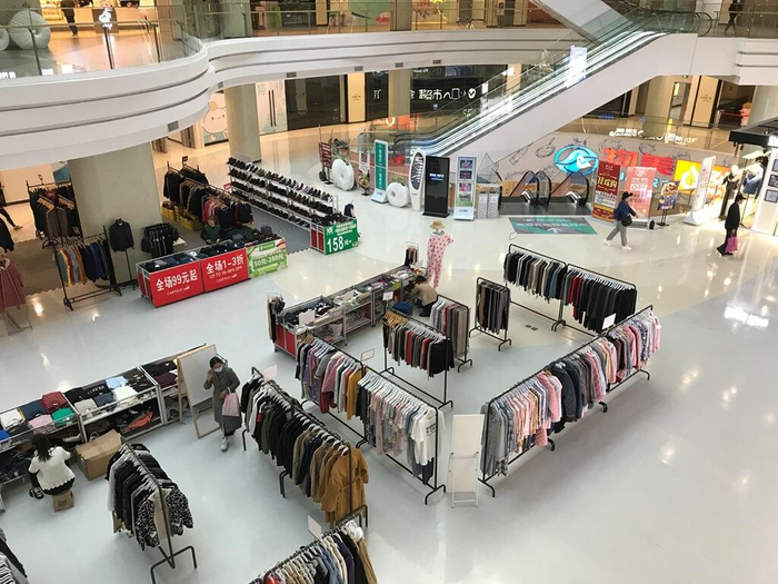 当时商场一楼中厅,一排排挂满衣服的落地衣架“特卖会”式聚集,一股浓浓的“奥莱”风迎面扑来。