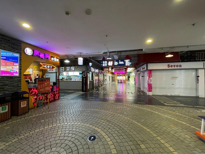 运河天地主街上的餐饮店、茶饮店大多数都已经歇业关门了。