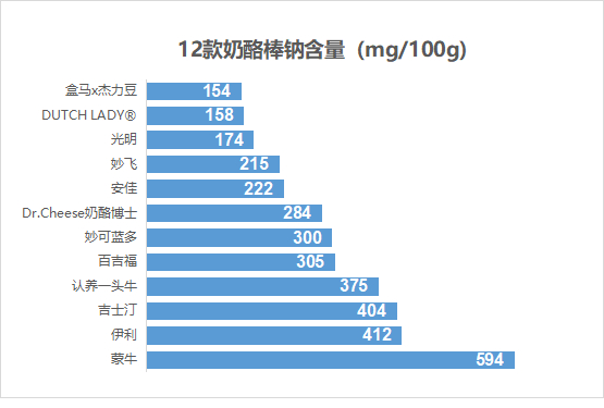 测试结果显示,12款奶酪棒钠含量差异明显,平均钠含量为300 mg/100g。其中,光明、DUTCH LADY®、盒马x杰力豆3个品牌的奶酪棒钠含量较低。