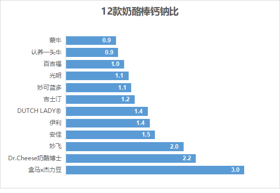 12款奶酪棒钙钠比平均为1.5,盒马x杰力豆、Dr.Cheese奶酪博士、妙飞的钙钠比表现较好。