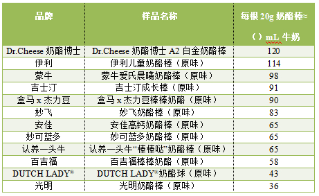 经查询食物营养成分查询平台得知,牛乳(均值)中钙含量为104 mg/100g。若每根奶酪棒按20g计算,以钙含量最高的Dr.Cheese奶酪博士样品为例,即每根奶酪棒钙含量≈120mL牛奶钙含量。