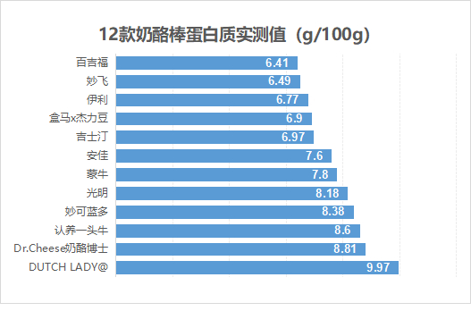 测试结果显示,12款奶酪棒蛋白质含量实测值范围在6.41g/100g-9.97g/100g之间,DUTCH LADY、Dr.Cheese奶酪博士、认养一头牛的蛋白质含量相对较高。